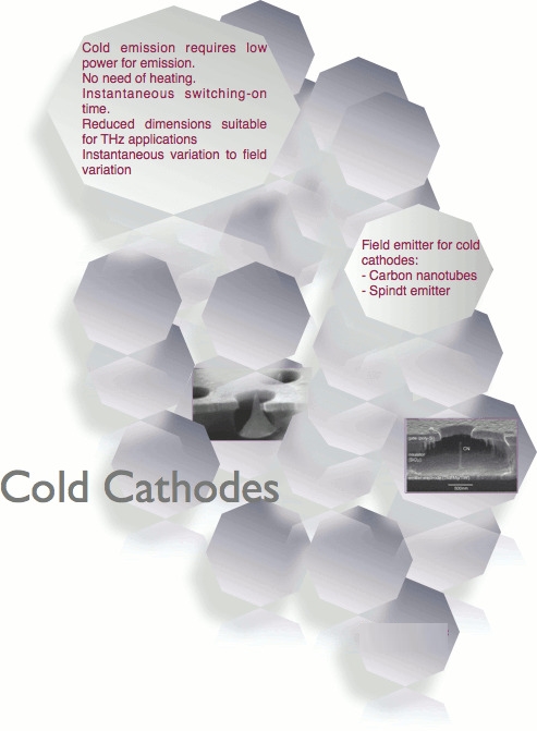 Cold emission requires low power for emission. No need of heating. Instantaneous switching-on time. Reduced dimensions suitable for THz applications. Instantaneous variation to field variation.